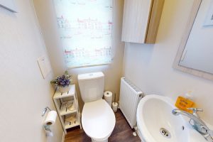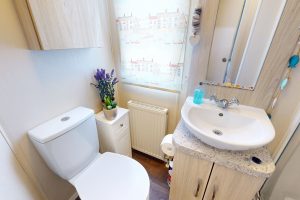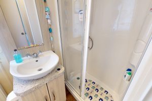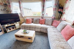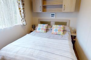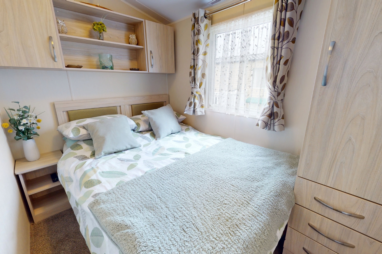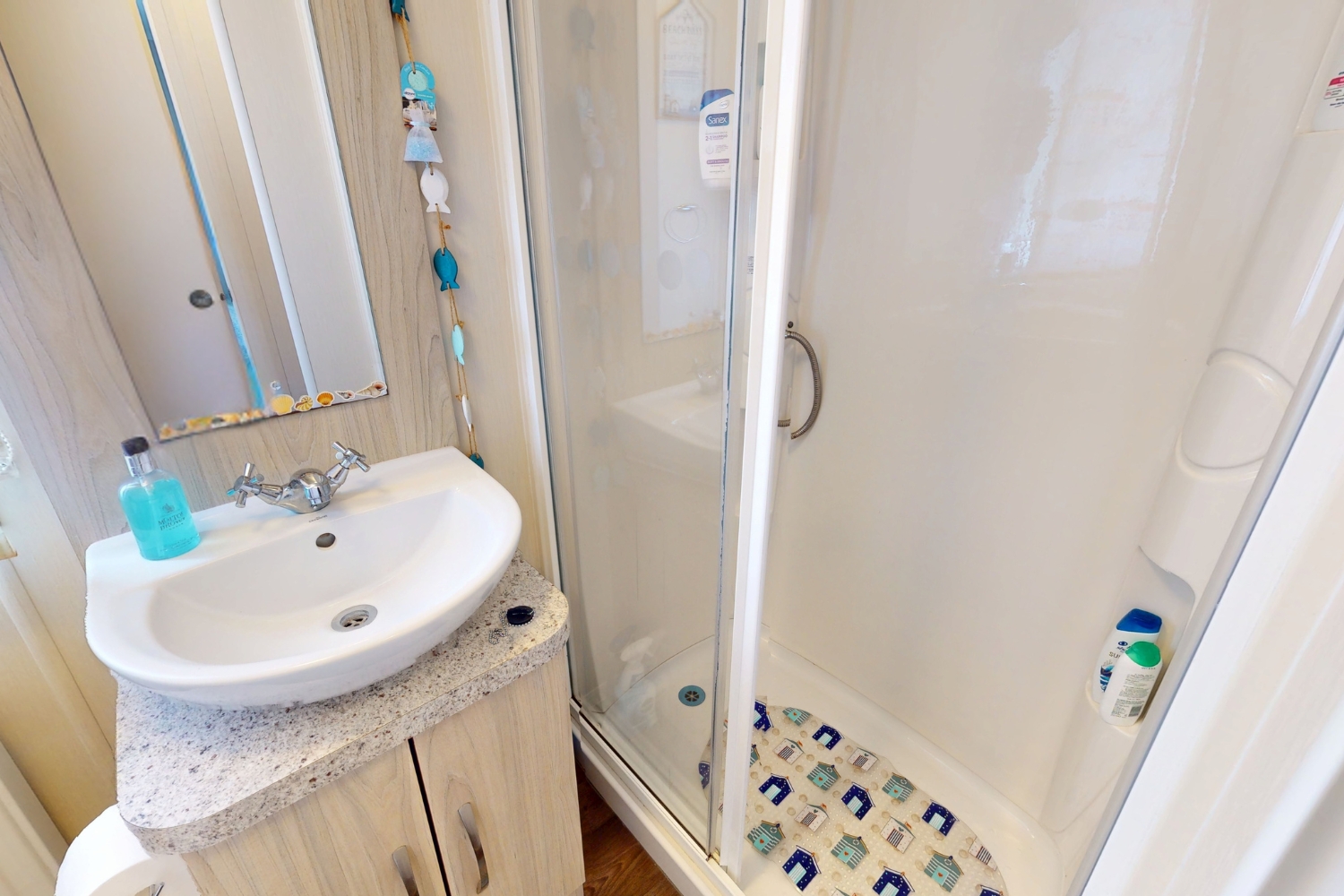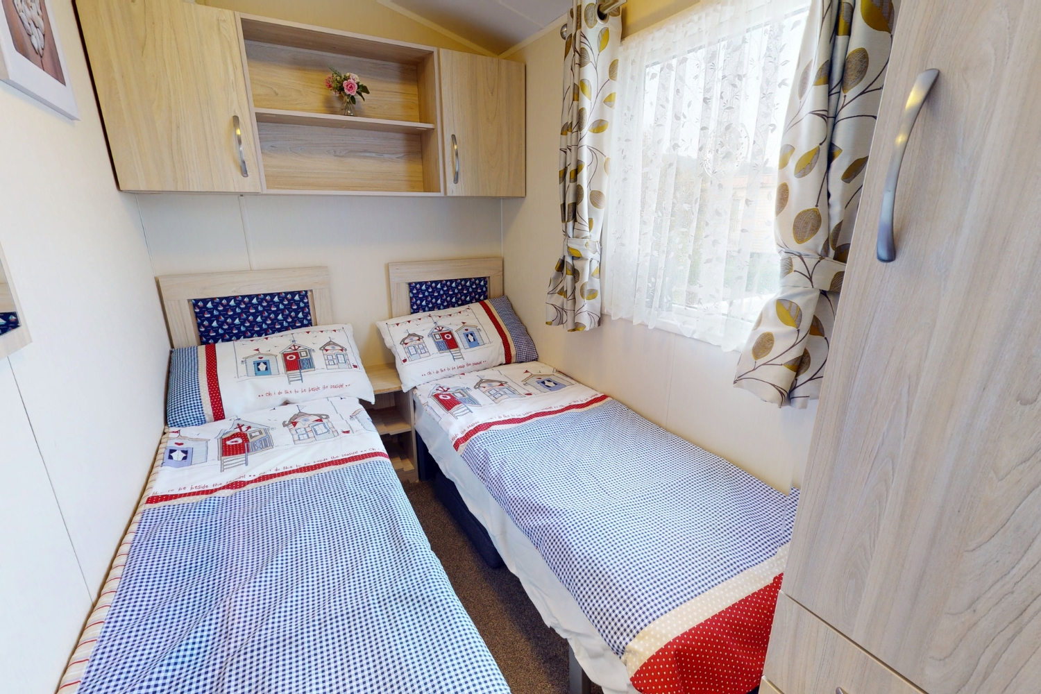Sleeping arrangements include a master double bedroom with storage and vanity area, along with two twin rooms, making this an ideal choice for families or guests. The bathroom includes a modern shower unit, wash basin, and WC. With double glazing and gas central heating, the caravan is warm and energy-efficient.